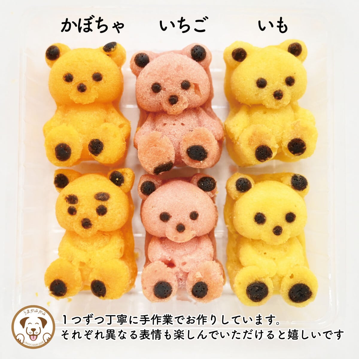 原材料:小麦粉、いちご果汁、パンプキン果肉、サツマイモ、全卵、糖類、トウモロコシ澱粉、水飴、ゼラチン、ベーキングパウダー、食用竹炭