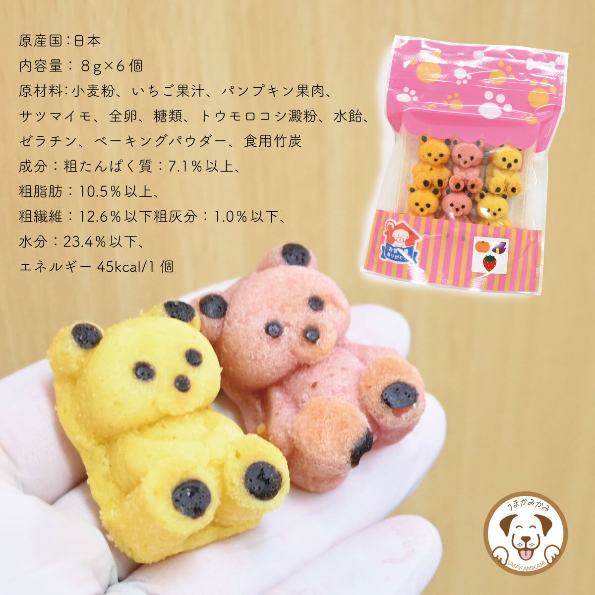 原材料:小麦粉、いちご果汁、パンプキン果肉、サツマイモ、全卵、糖類、トウモロコシ澱粉、水飴、ゼラチン、ベーキングパウダー、食用竹炭