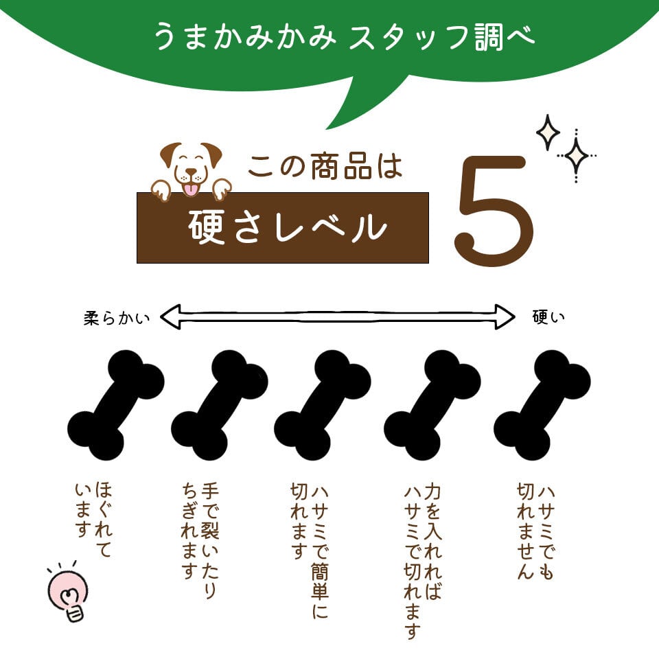 ※硬さ・尖りのある製品です。飼い主様の目の届くところでお与えください。特に丸のみ癖のあるワンちゃんに与える際は、小さくなったら取上げて廃棄するなどの対応をお願い致します。(噛み残しを放置しないようにご注意ください。)